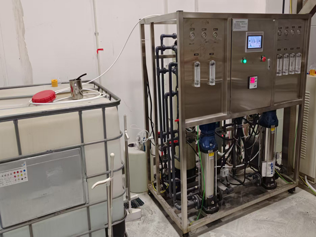 原水箱—增壓泵—多介質(zhì)過濾器—活性炭過濾器—保安過濾器—高壓泵—一級反滲透—高壓泵—二級反滲透—中間水箱—增壓泵—保安過濾器—EDI系統(tǒng)—純水箱